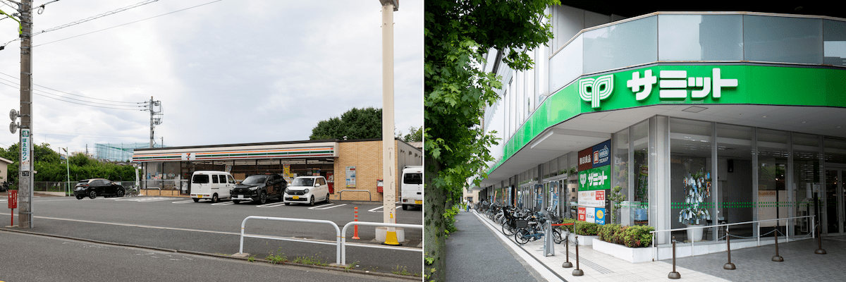 最寄り駅はどちらも賑やかですが、マンションの隣がコンビニだったり、スーパーも近くにあったり、駅前まで出なくても買い物は事足りそうです。