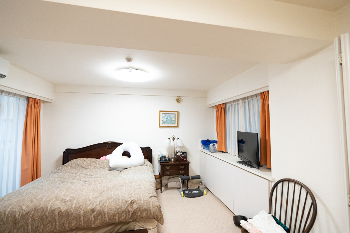 13帖の寝室。大きなベッドを使っても余裕のある広さ