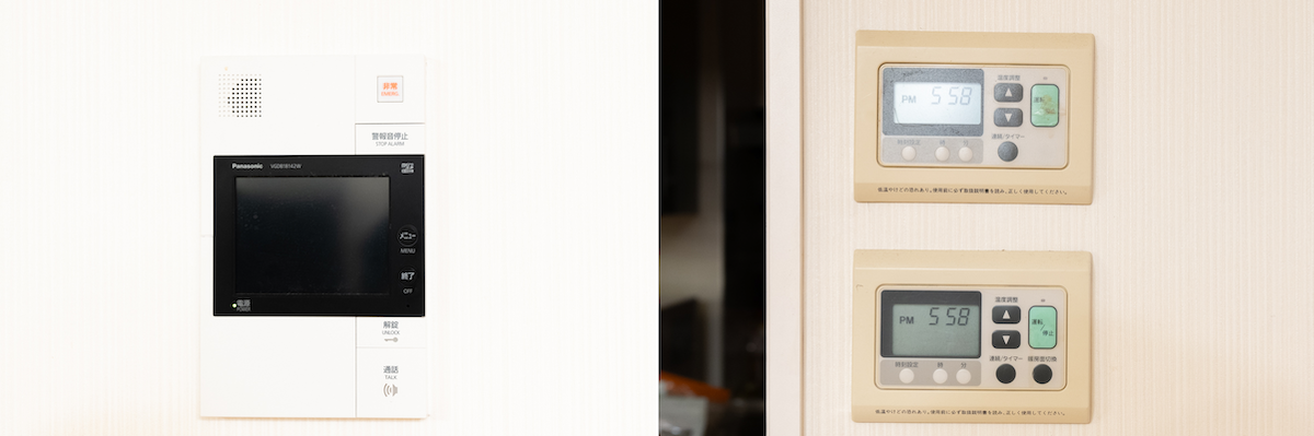 玄関のモニターとリビングの床暖房のスイッチ。2室をつなげた広いリビングには床暖房のスイッチが2つ