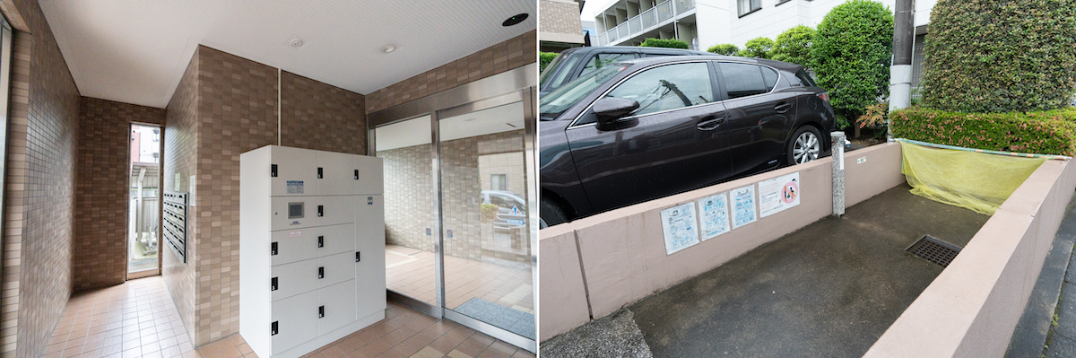 マンションのエントランスには宅配ロッカーを完備。ゴミ捨て場は駐車場スペースの一角にある