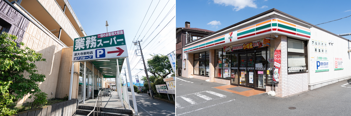 銭湯の向かいにある業務スーパー(左)。バス停横にあるコンビニも近い(右)
