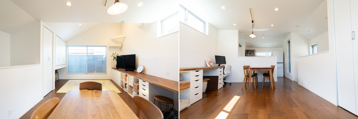 壁は白、床はウォールナットのフローリングに統一。家全体がコンパクトなので、各スペースに収納を多く作り、スッキリ暮らせるよう工夫しました。