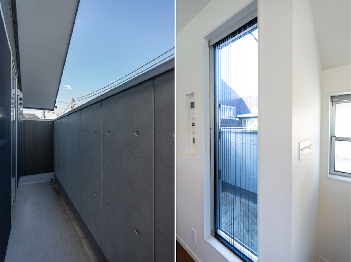 大きいバルコニーの外壁は、向かいの家からの目隠しになるよう高めに設計しました。キッチン横のバルコニーはちょっとした物を置いておくのに便利ですよ。どちらも窓を開けた瞬間風が抜けるので、開けていることが多いですね。