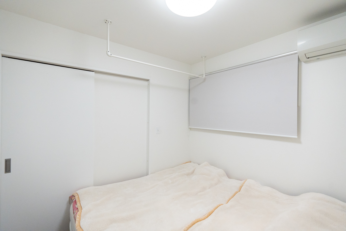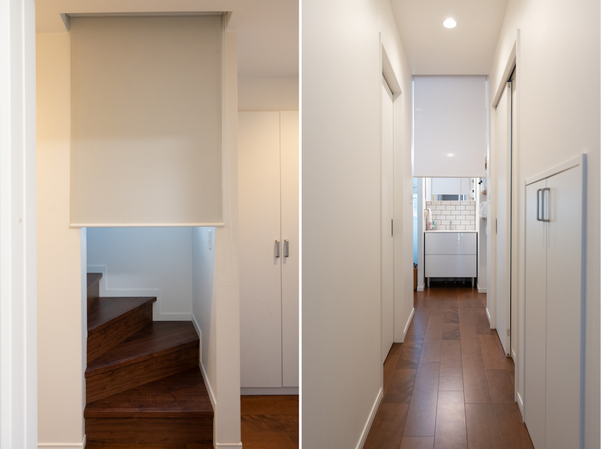 階段下と洗面所入口にロールカーテンを完備。2階のエアコンの冷気を遮断し(左)、来客時には目隠しにできる(右)