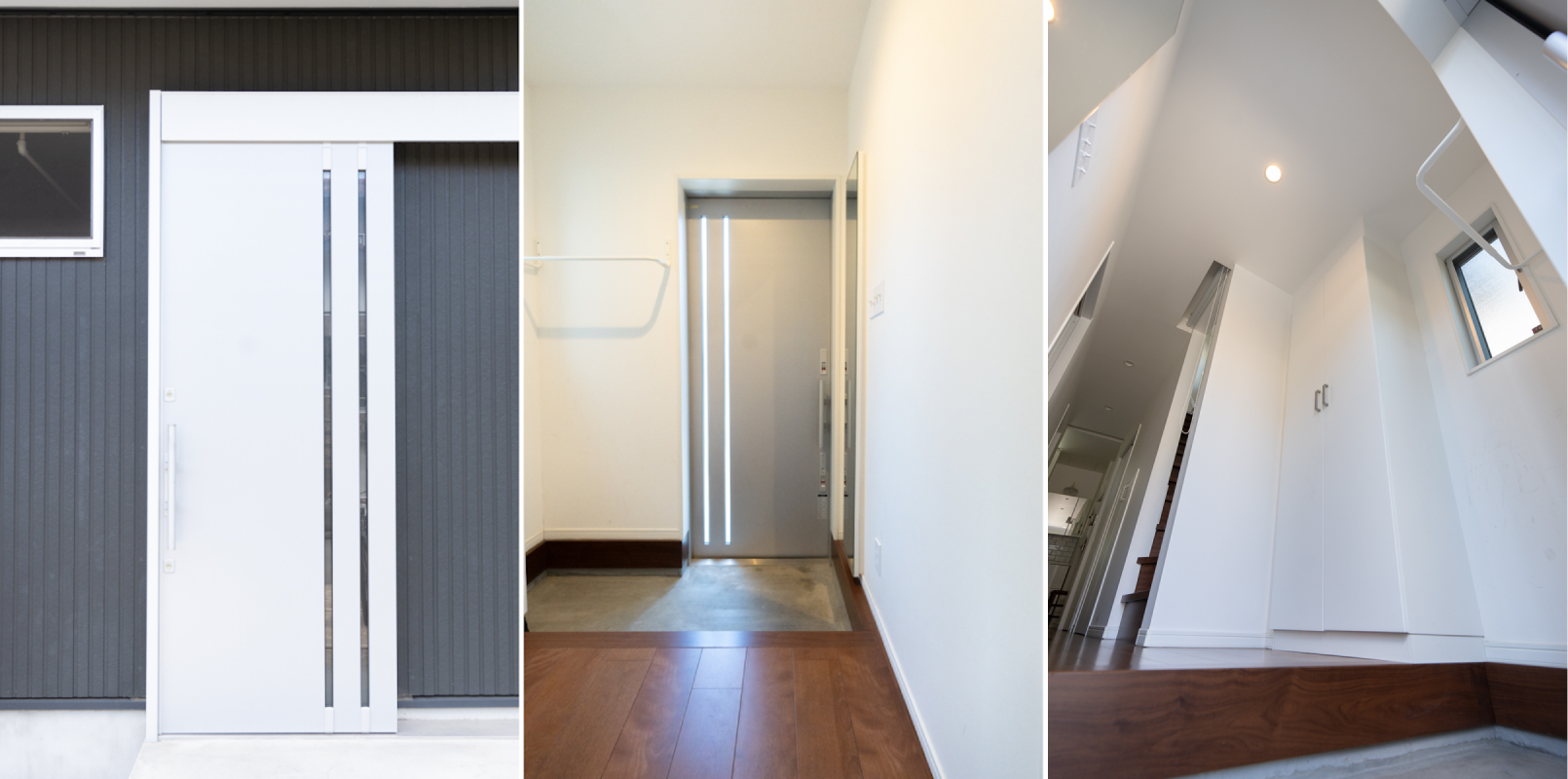 玄関(左)洗面所(中央)リビング(右)など、デッドスペースを上手に活用した収納スペースがたくさんある