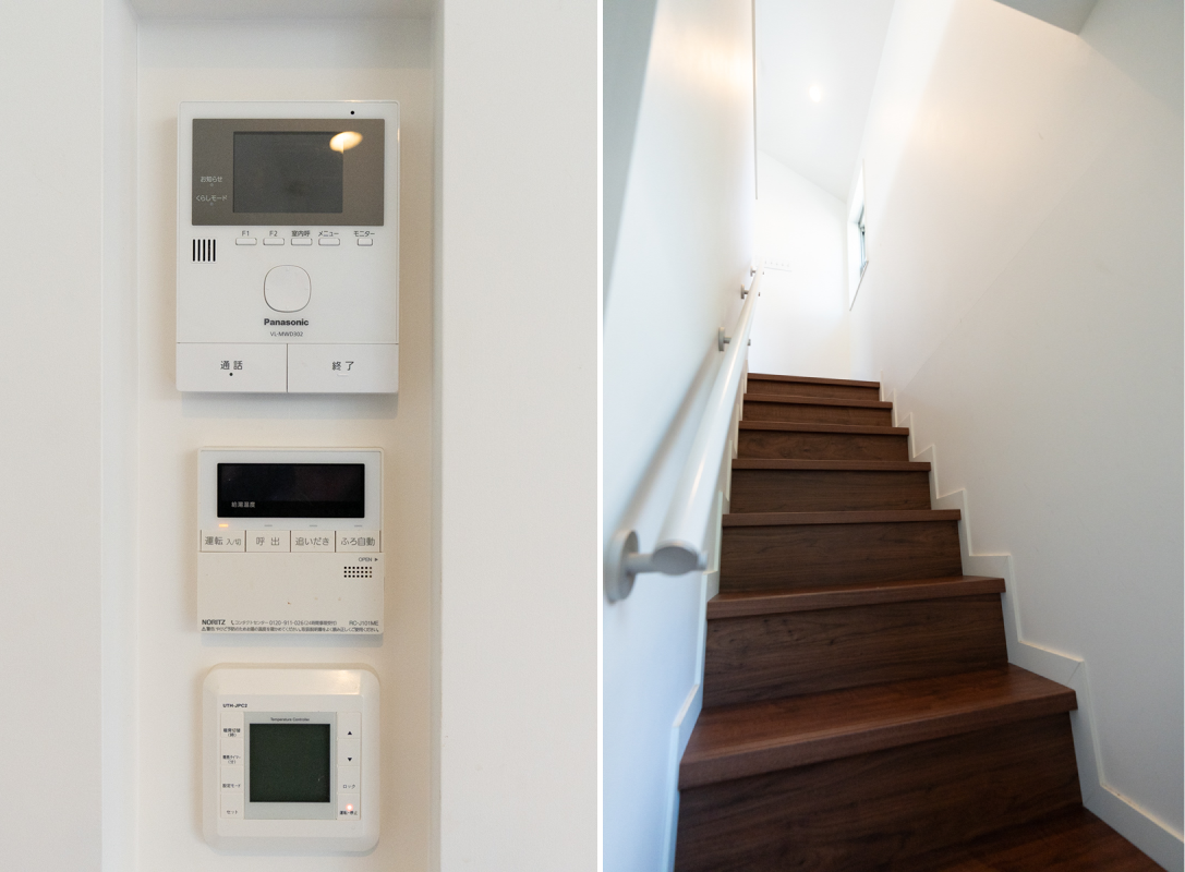 キッチンの壁にインターホン・給湯器・床暖房の操作パネルを集約し使いやすく設計(左)。階段も目立った傷は見当たらない(右)