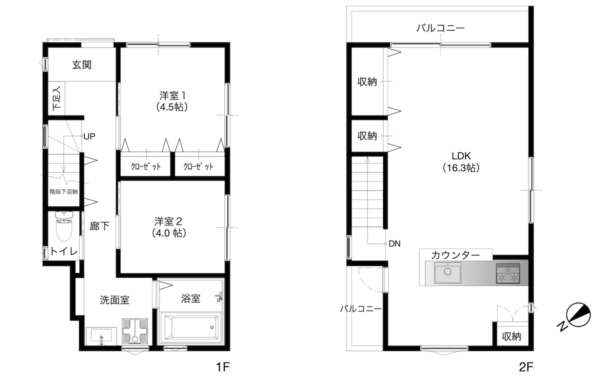 2階にはリビング奥(左)とキッチン横(右)にバルコニーがある