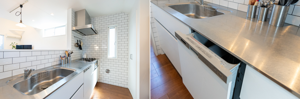 対面キッチンの壁はタイルで統一。白いキッチンは清潔感がある。食器洗浄機もビルトインされているので、調理スペースが広々としている