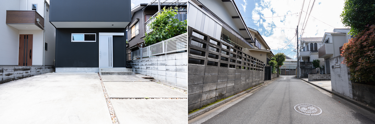 玄関前には自転車・ワゴンと軽自動車を止められる。プランターを置いて家庭菜園も楽しめそう(左)。前の通りは車通りが少なく子どもを遊ばせるにも安心(右)