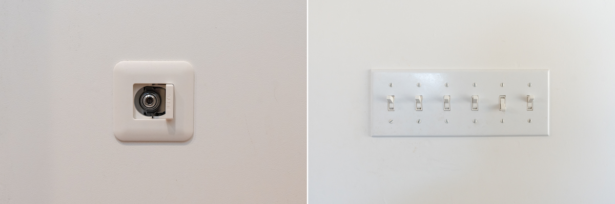 各部屋にガス栓があり、どの部屋にいても暖かく過ごせる(左)。電気スイッチはアメリカンスイッチに全て統一されていてデザイン性が高く、シンプルで美しい(右)