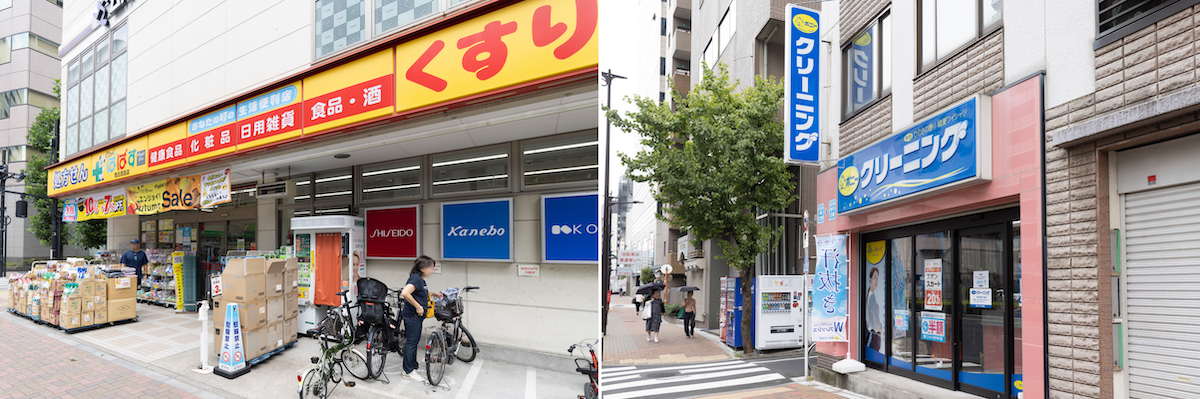 マンションから徒歩1分のところにドラッグストア。クリーニング屋も目と鼻の先