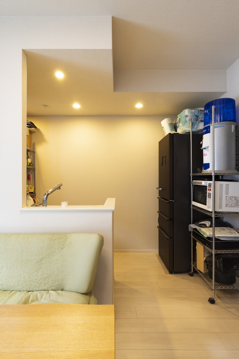 くつろぎ空間としっかり区分けをしつつ、作業中にはリビングのテレビも観れるカウンタータイプのキッチン