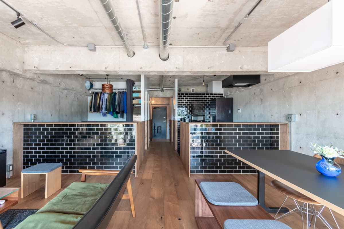 腰壁でゆるくゾーニングしたワンルームにリノベするのもおすすめ。生活感を出したくない場所もスッキリ隠しつつ、空間を効率的に活用できます。スケルトン工事で天井も上げられるので、より広く感じられますよ。