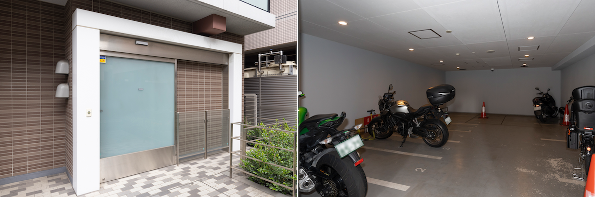 自転車置場とバイク置き場は屋内。住人のみ開閉可能な扉で仕切られている