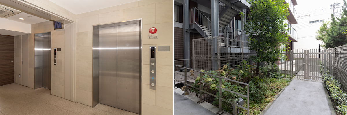 エレベーターは2基。グリーンが多めな敷地内