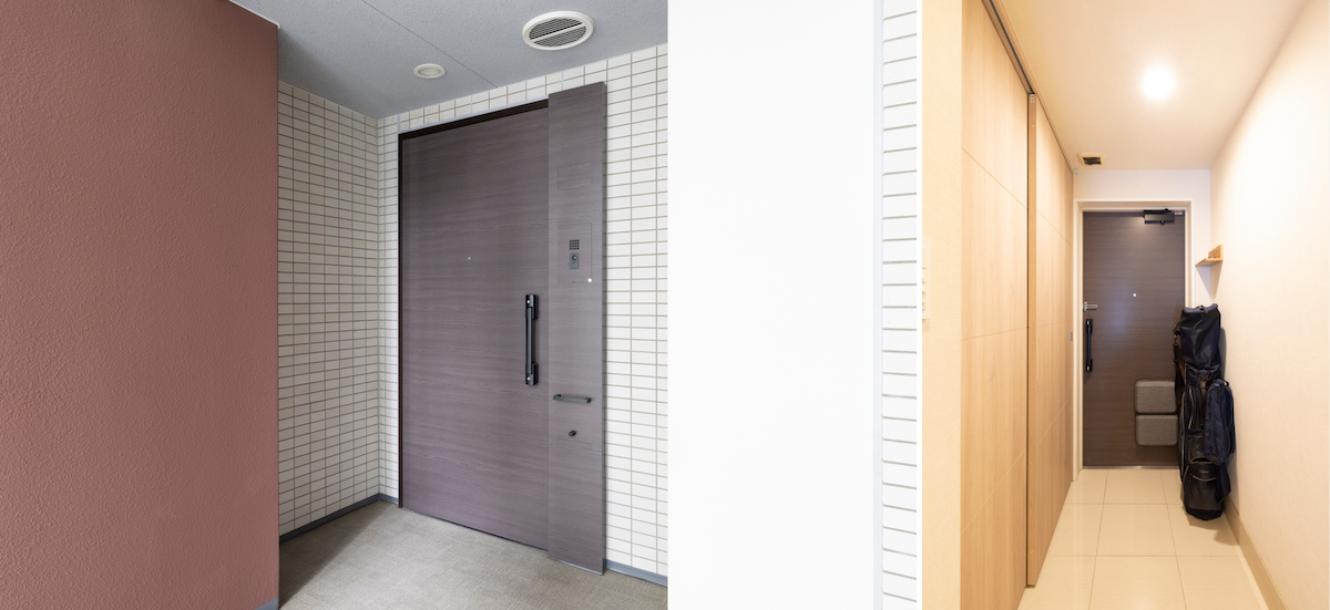 少し奥まったところに玄関。玄関土間が広く、ちょっとした荷物を置いてもゆとりがある
