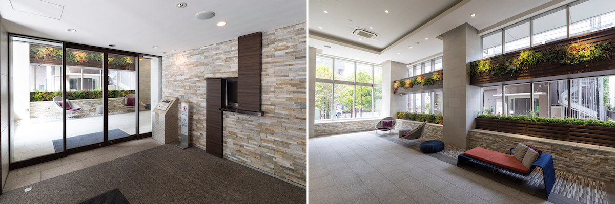 清潔感のあるエントランス。ロビーは天井が高く、開放感がある