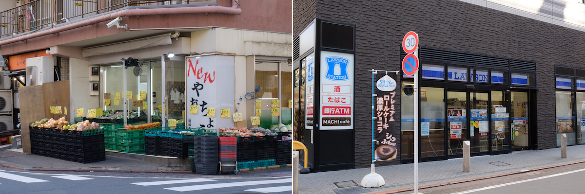 マンション1階の八百屋はリーズナブルさで人気。その向かいにはローソンがある