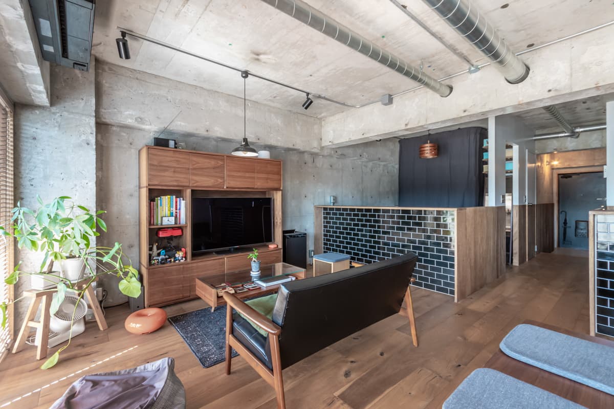 より広々とさせたいなら、間仕切りを取り払って、天井をスケルトン仕上げにしてみては。低めの壁で空間をゆるく仕切れば、開放感を確保しつつ、寝室や収納といった生活感の出やすいスペースを自然に目隠しできます。