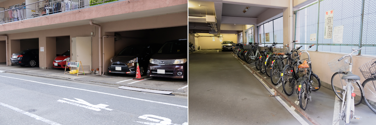 駐車場は台数が少なめ。駐輪場は1軒につき1台分は無料。この他にバイク置き場もある