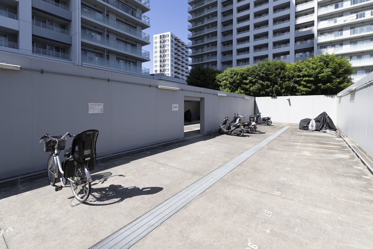 駐車場は立体式、機械式、平置きの3種で、収容台数もかなり多い。オートロックで守られた屋内バイク置き場もあってライダーも安心