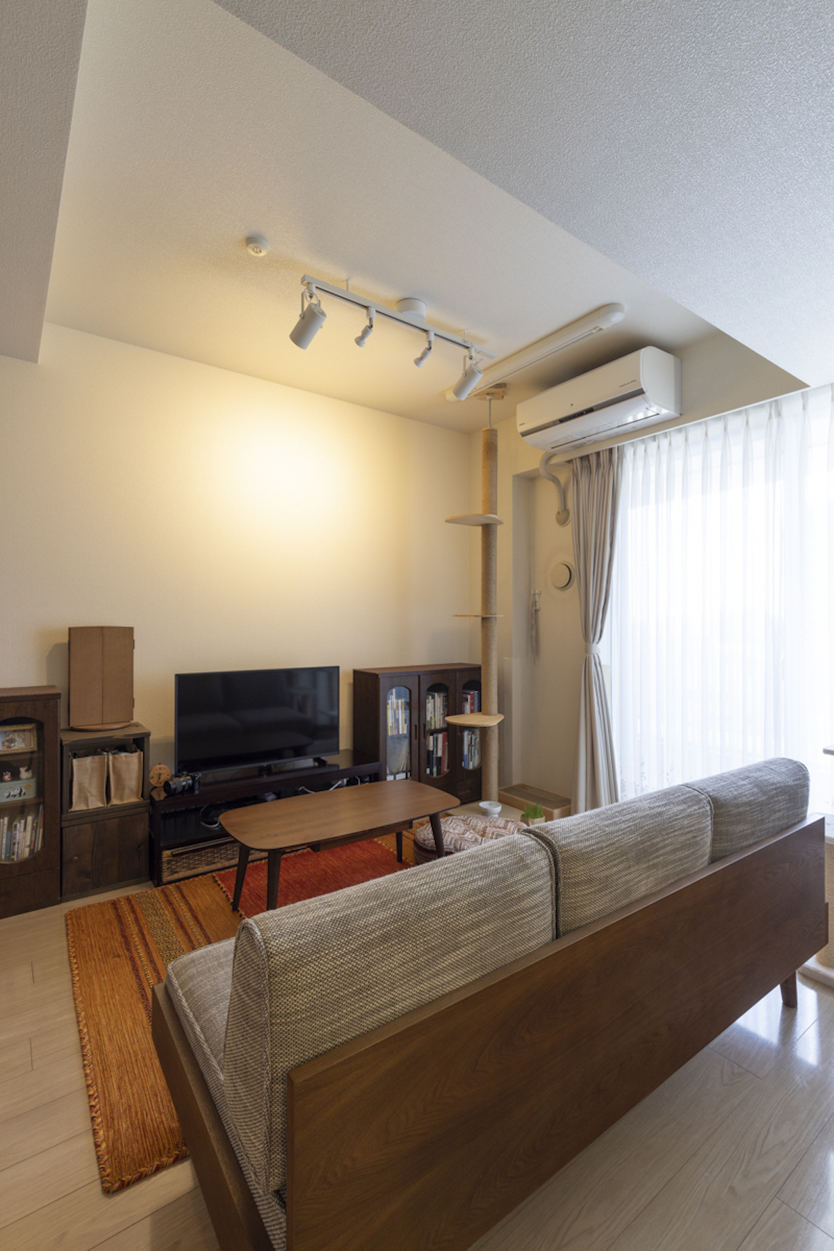 3人掛けのソファーとキャットタワーを置いても余裕のある広さ。寛ぐスペースの天井が高くなっているので開放感がある