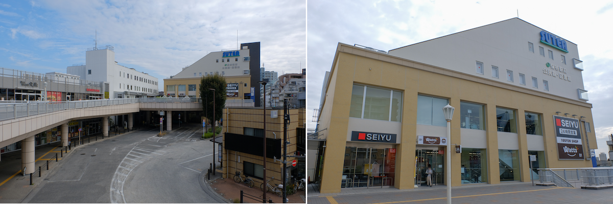 保谷駅南口。西友 保谷店は24時間営業。同ビル地下1階には100円ショップのワッツもある