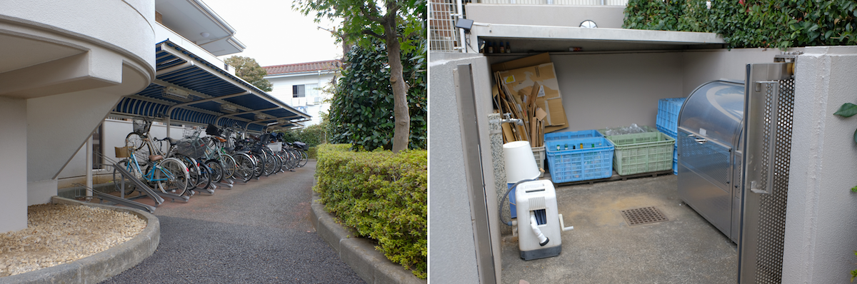 駐輪場(左)とごみ捨て場(右)。「きちんと管理され、不満を感じた事はありません」とのこと