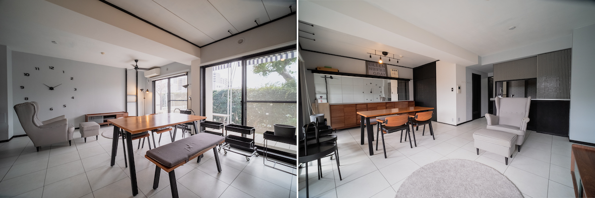 リノベーションにより2部屋を繋げたリビング。白で統一された壁・天井・床に、テラスか自然光が差し込み、昼間はとても明るい