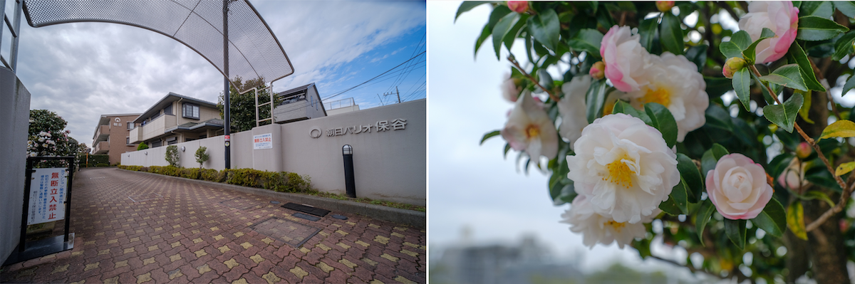 外観やアプローチはとてもきれい。訪問時には手入れの行き届いた生垣の山茶花が、大きな花を咲かせていた