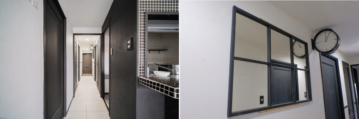 玄関からリビングへ続く廊下。室内の装飾には鏡や時計を意識的に使用している。これらは売主がDIYで仕上げたそう