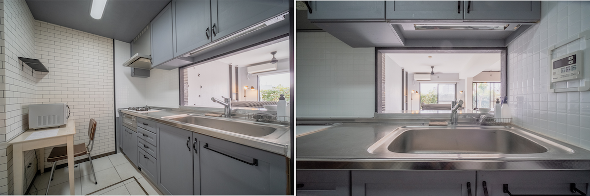 アイスブルーのキッチンは涼しげな印象。シンク越しにテラスの緑が見える