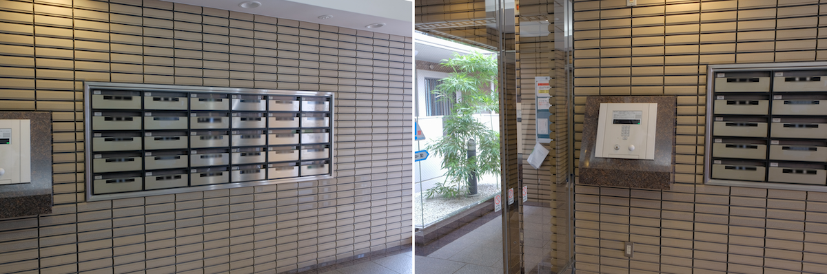 管理人室の向かい側に郵便受け。オートロックはタッチキーでも解錠可能