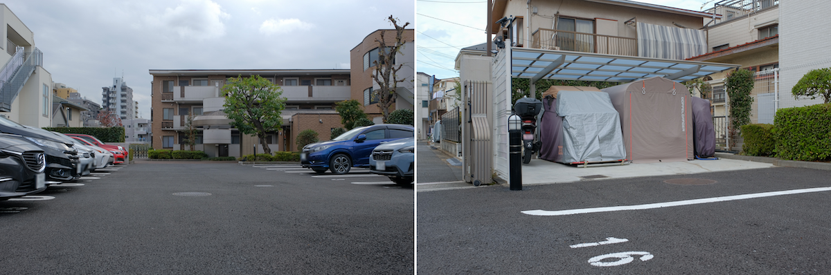 マンション北側には広々とした駐車場(左)と、バイク置き場(右)がある