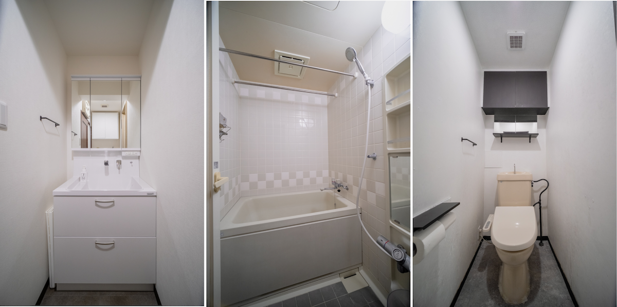 水まわりは全体的にとてもきれいに保たれている。洗面の対面は同幅の洗濯機スペースで、ドラム式洗濯機も設置可能