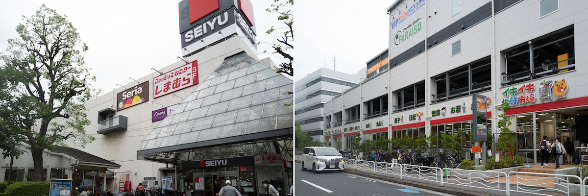 マンションから徒歩10分のところにSEIYUと地元で人気のスーパーイキイキ生鮮市場が立ち並んでいる