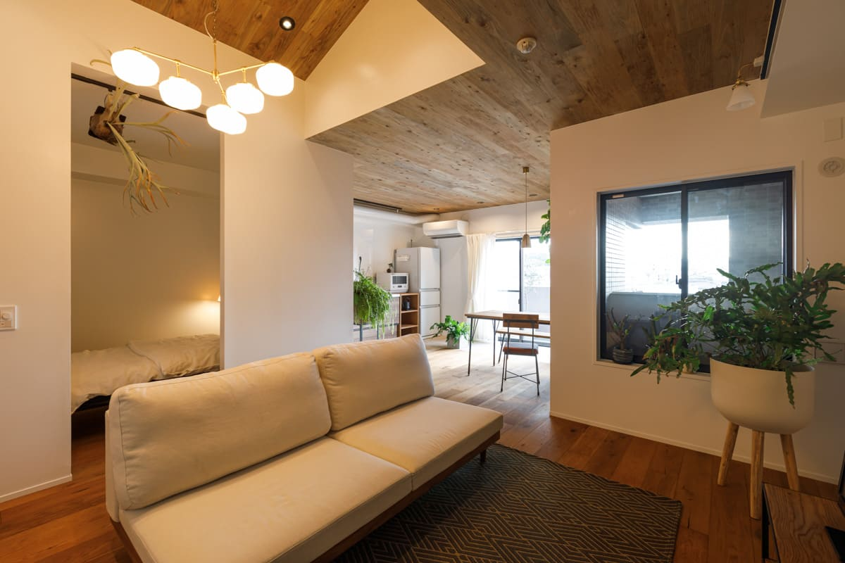 リノベなら間取り変更はもちろん、床材や天井・壁のデザインを変えることもできます。天井を木目調にしたり、床材を天然の無垢材に変更したり、インテリアのこだわりを追求してみてはいかがでしょうか。