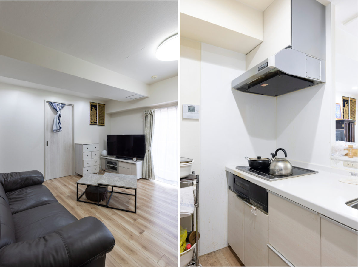 (左)バルコニーからの光でとても明るいリビング(右)キッチンはカウンタータイプ。IHコンロ