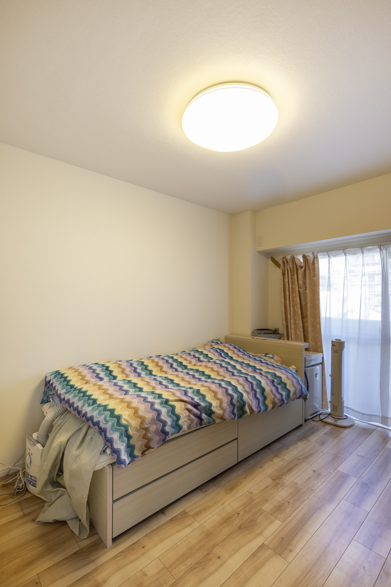 リビングと同じ壁紙で仕立てられている個室。バルコニーからしっかり光が入って気持ちよく過ごせる