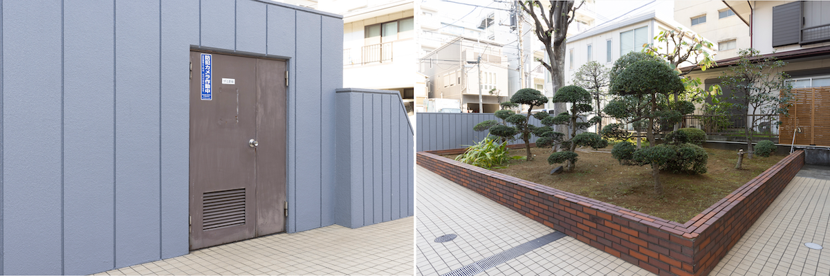 ゴミ置き場は敷地内にあり、24時間ゴミ出しOK。手入れの行き届いた植栽もある