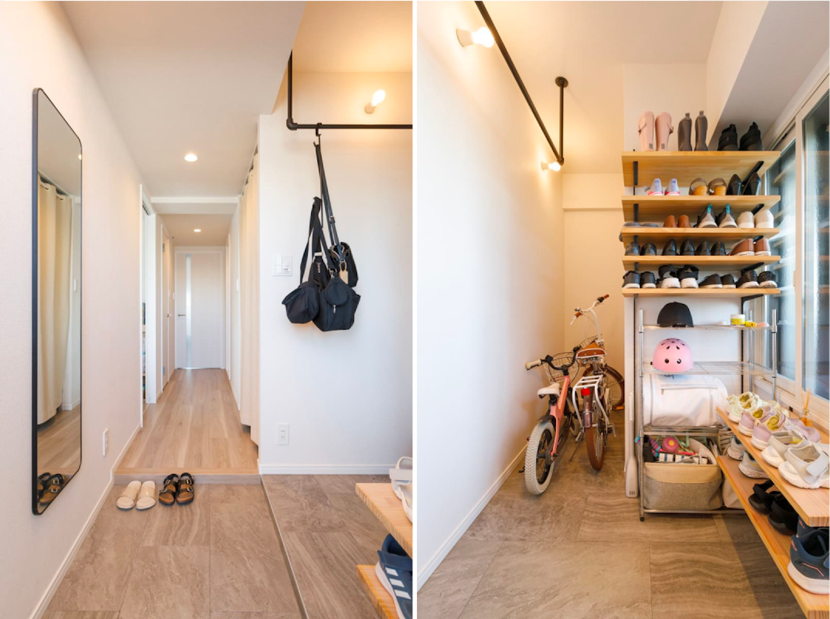 既存の廊下まで思い切って玄関にするのもおすすめです。外遊び用品もそのまま収納できる造作棚や、鞄やコートがかけられるおしゃれな物干しも人気の設備ですよ。