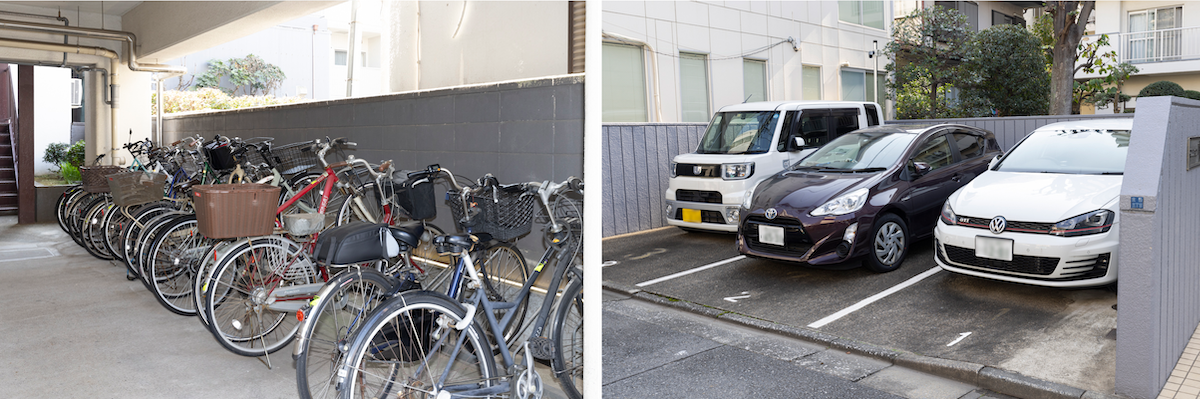 収容台数の十分な駐輪スペース。駐車場は入り口前の3台のみ