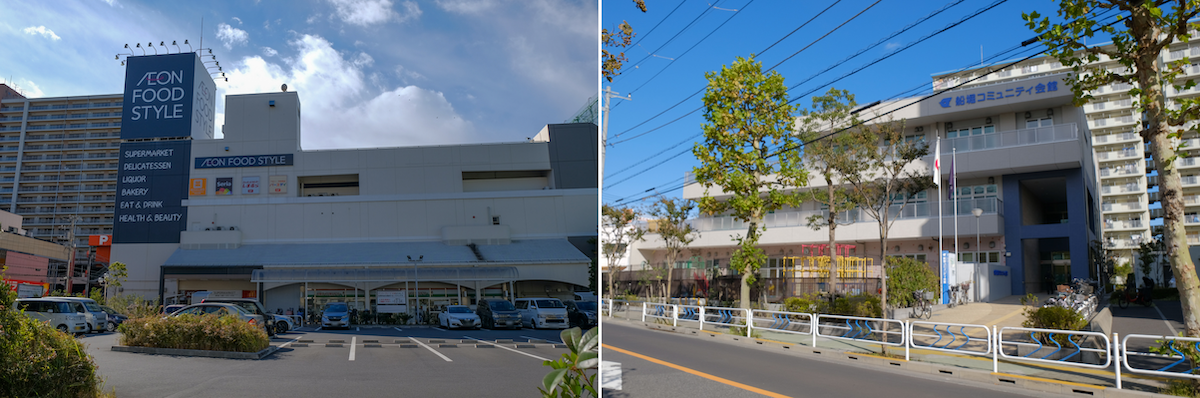 ファストフード店や100円ショップ、学習塾なども入居するイオンフードスタイル船堀店(左)、船堀コミュニティ会館(右)では休日に卓球室が一般開放される