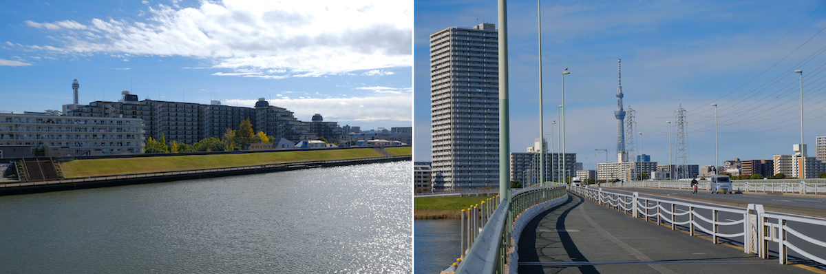 物件は中川と荒川が並んで東京湾へ向かう区間沿いにある。2つの河川にまたがる船堀橋からは、東を向けばハイラーク船堀を、西を向けば東京スカイツリーを臨める