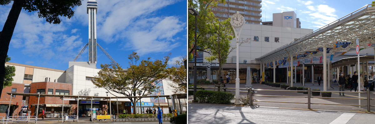 最寄りの都営新宿線 船堀駅南口を出て振り返ると、駅の北側にタワーがそびえ立っていますね。なかなかの壮観です!