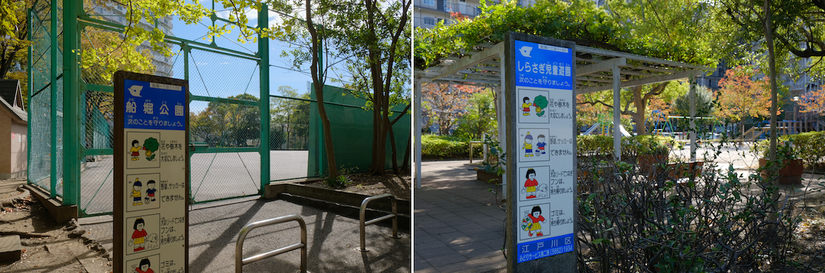 物件東隣には子供用遊具や球技用コートがある船堀公園(左)、物件西隣にはアスレチック遊具があるしらさぎ児童遊園(右)があるため、子どもの遊び場には困らない