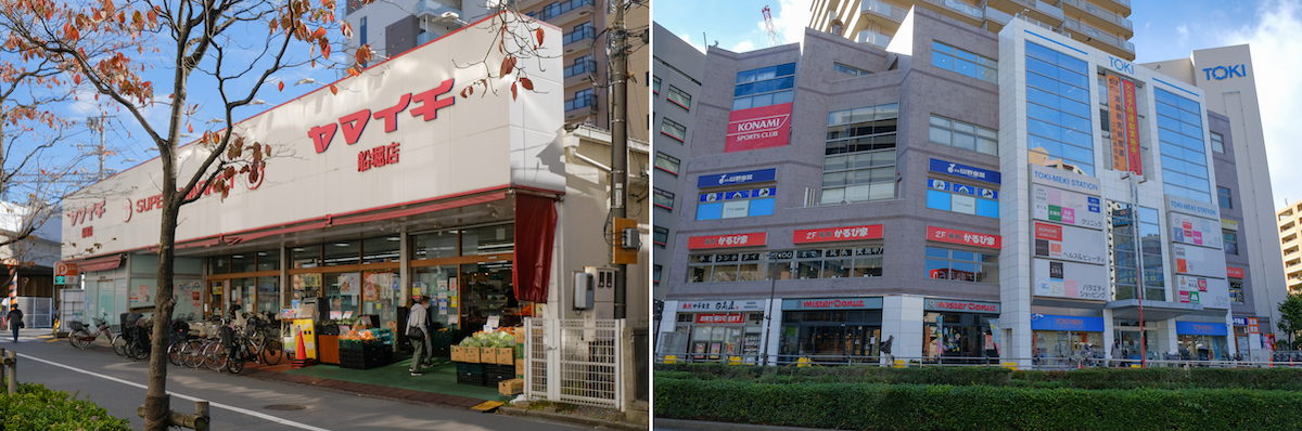 駅周辺にはトキビル(右)の他にもさまざまな商業店舗がある。駅徒歩2分のヤマイチ 船堀店(左)は江戸川地区の地域密着型スーパー
