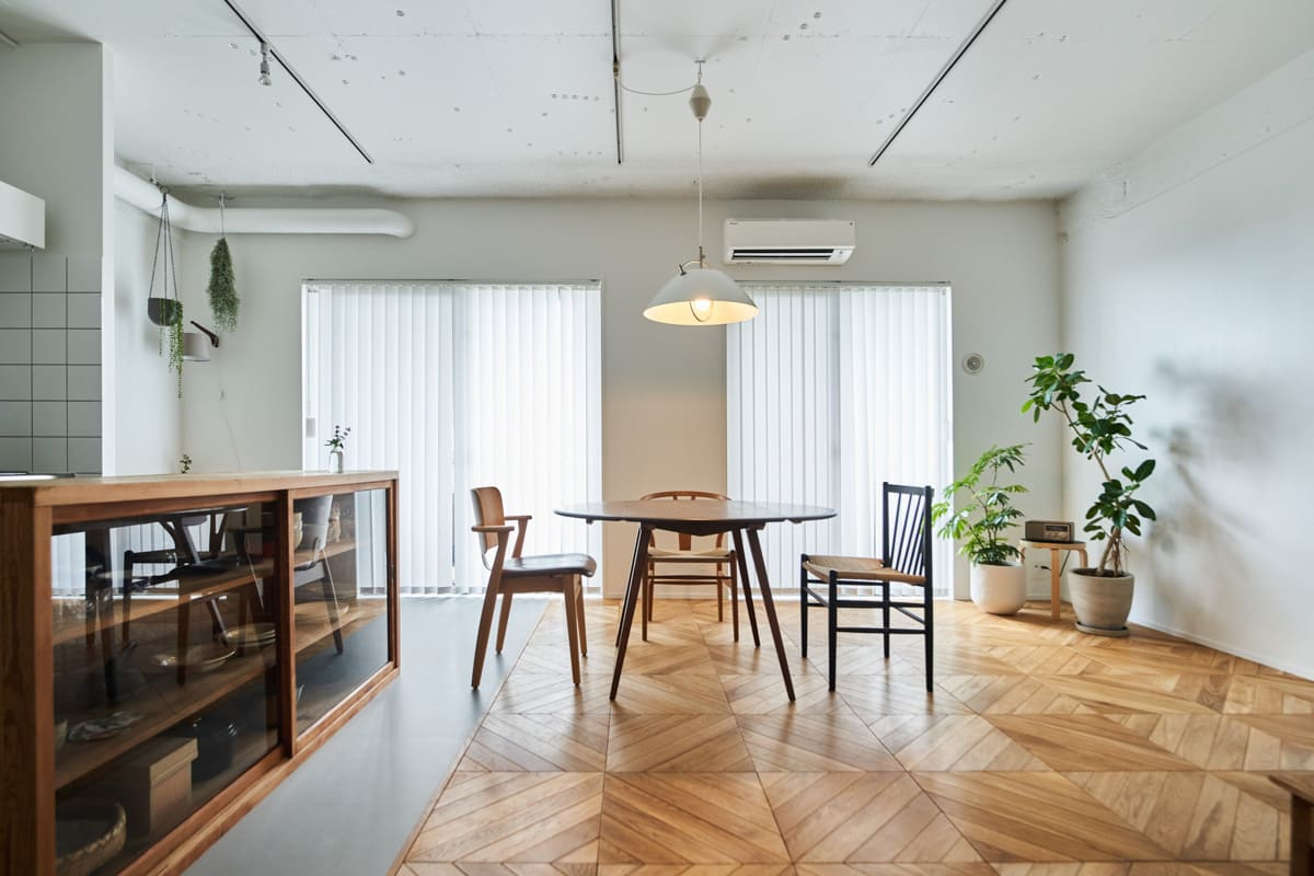 こだわりのインテリアが映えるシンプルなLDKにリノベーションするのもおすすめです。キッチンはタイル張りでお手入れしやすく。リビングのパーケットフローリングは、空間に表情が生まれるため人気が高まっていますよ。