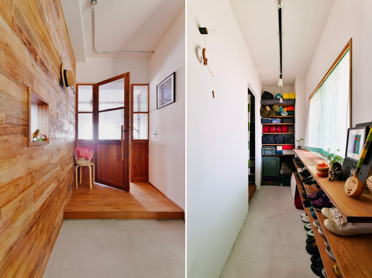 リノベなら、イメージ写真のように床だけでなく壁や扉にも木材を用いて空間をデザインすることも可能です。外廊下側の空間は土間に変更し、柱の出っ張りを活かした造作収納を設けると空間を最大限に活かしきることができます。