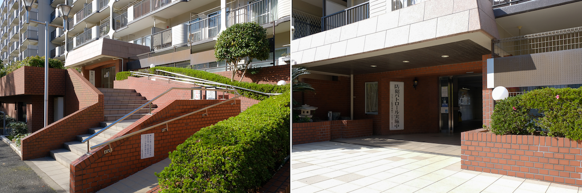 エントランスは地上より高い位置にある。南・中央・北に3カ所あり、今回のお部屋へは南エントランスが近い